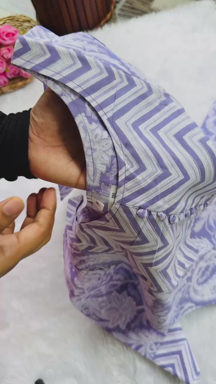 This simple and charming lavender coord set features an all-over print on breathable cotton fabric with a soft cotton lining for added comfort. It includes matching pants and delicate potli buttons on the yoke, enhancing its tailored appearance. With 3/4 sleeves and side slits, this versatile set is ideal for daily wear, casual outings, or formal occasions.